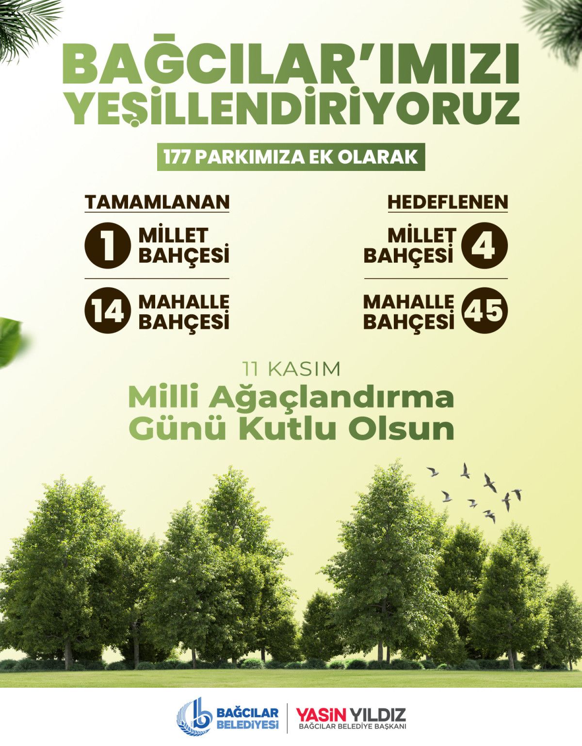 Bu amaçla hem Mahalle Bahçelerimizin sayısını hem de Millet Bahçeleri sayımızı artırıyoruz. İnşallah yakın zamanda Mahalle Bahçesi sayımız 45, Millet Bahçesi sayımız da 5 olacak. Böylece ilçemizin çehresi de güzelleştirmiş olacağız.