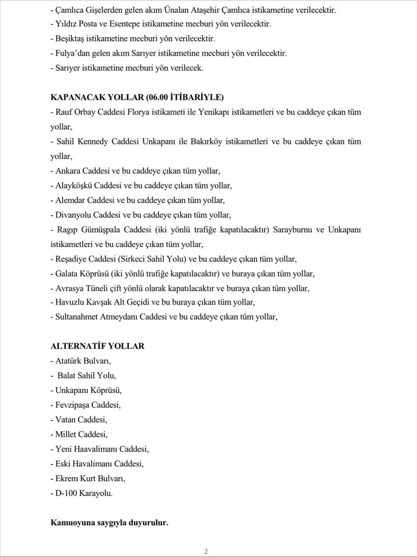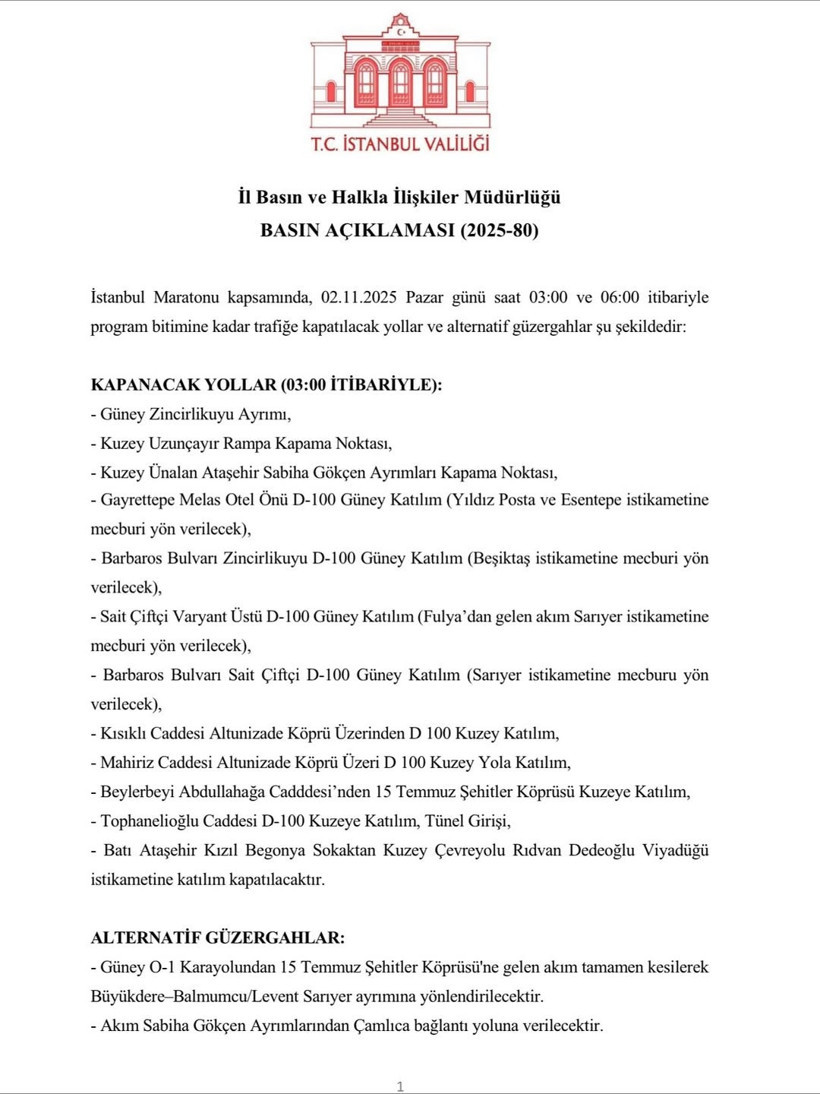 İstanbul Valiliği, 2 Kasım Pazar günü gerçekleşecek olan İstanbul Maratonu kapsamında belirli yolların trafiğe kapatılacağını duyurdu. Saat 03.00’ten itibaren başlayacak olan kapanmalar, etkinlik sona erene kadar devam edecek ve alternatif güzergahlar oluşturulacak.