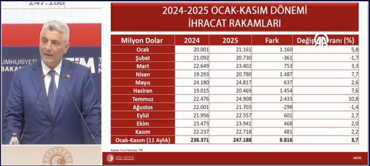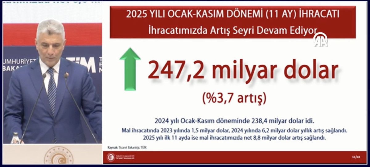 2025 yılı Ocak-Kasım ayları arasındaki 11 ayda yüzde 3,7 artışla 247 milyar 188 milyon dolarlık ihracat yapıldı.
