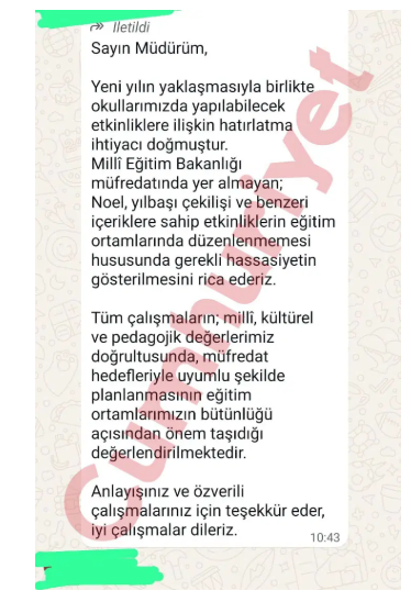 İletide, “Noel, yılbaşı çekilişi ve benzeri içeriklere sahip etkinliklerin eğitim ortamlarında düzenlenmemesi hususunda gerekli hassasiyetin gösterilmesi” talep edilirken, tüm çalışmaların “millî, kültürel ve pedagojik değerler doğrultusunda, müfredat hedefleriyle uyumlu şekilde planlanması gerektiği” ifade edildi.