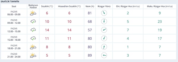 09.00-12.00 arasında sıcaklık 10 dereceye yükseliyor. Günün en ılık saatleri ise öğle saatleri olacak. 12.00-15.00 aralığında sıcaklık 14 dereceye kadar çıkarak günün zirvesine ulaşıyor. Ancak bu saatlerde kısa süreli yağmur bekleniyor. 15.00-18.00 saatleri arasında yağış etkisini artırarak devam ediyor. Sıcaklık 11 dereceye düşüyor. Akşam saatlerine gelindiğinde yağışlar duruyor ancak hava yeniden soğuyor. 18.00-21.00 aralığında sıcaklık 8 dereceye düşerken gece saatlerinde termometreler 5 dereceyi gösterecek.