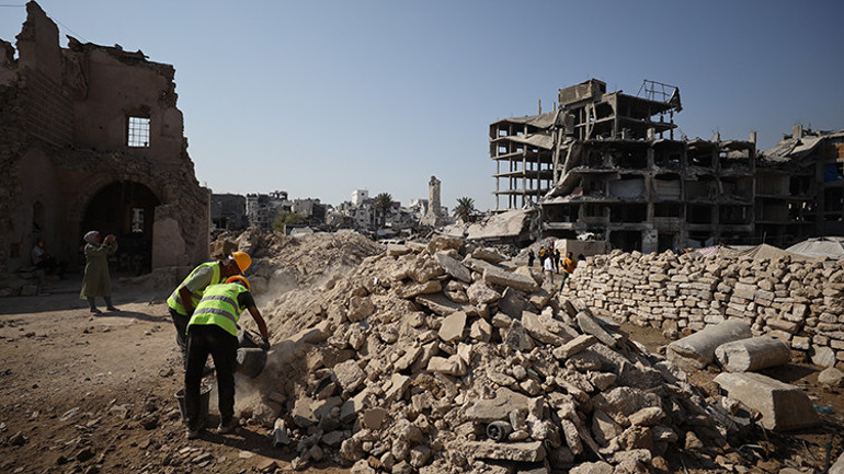 Teknisyenler ve işçiler, çoğunluğu enkaza dönen saraydan geriye kalanları kurtarmak için molozlar arasında çalışıyor. İlkel ekipman ve kısıtlı imkanlarla etrafa saçılmış tarihi eserlere ait parçaları arayan teknisyenler, Gazze’nin tarihi kimliğinden geriye kalanları korumaya çalışıyor.