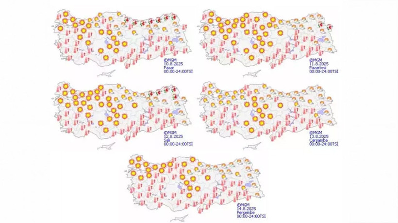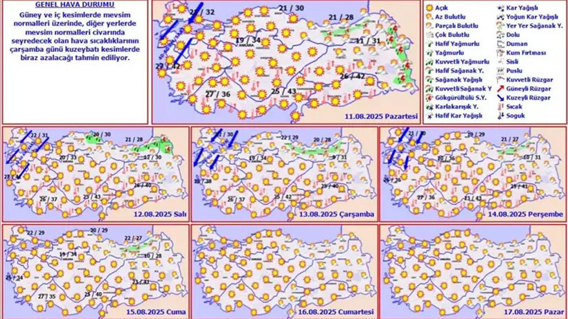 CNN TÜRK Meteoroloji Danışmanı Prof. Dr. Orhan Şen, “Önümüzdeki 1 hafta yurtta yağış yok. Sıcaklıklar hafta ortasına kadar Ege Akdeniz GDA da yüksek seyrediyor. Hafta ortasından itibaren Marmara İç Anadolu dahil kuzey bölgelerde sıcaklık 3-4 derece azalacak. Bu yaz ilk defa ortalamanın 1-2 derece altına inecek. Önümüzdeki hafta sonuna doğru Diğer bölgelerde de azalma olacak ama ortalamanın altına inmeyecek.
