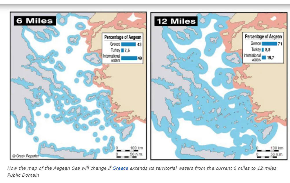 Yunanistan Dışişleri Bakanı Yorgos Gerapetritis, Yunanistan’ın karasularını genişletme kararının geri alınmayacağını duyurdu. Türkiye’nin Ege Denizi’nde karasularını 6 deniz mili olarak kabul ettiği 1995 tarihli TBMM kararının bu durumu “savaş sebebi” olarak gördüğü hatırlatıldı. NATO üyesi iki ülke arasındaki tansiyon son yıllarda düşmüş olsa da, Ege Denizi’nde deniz yetki alanları, hava sahası ve enerji kaynakları konusundaki anlaşmazlıklar tekrar gündeme geldi.